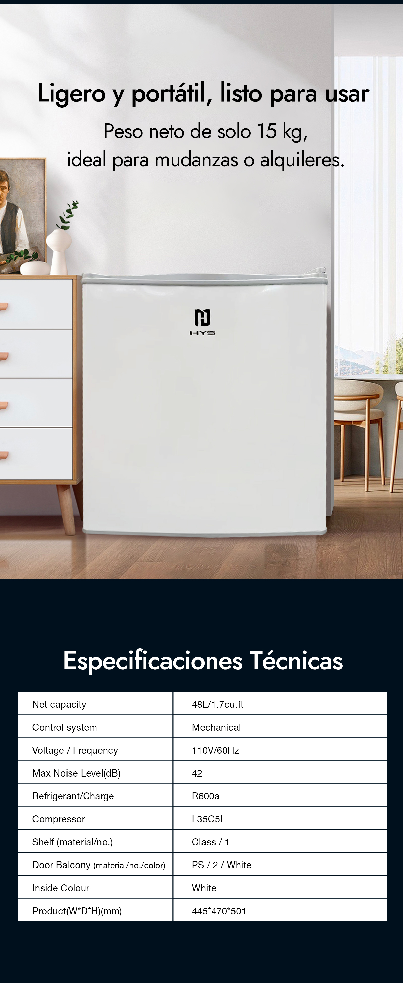 Capacidad compacta de 48L, gran eficiencia en espacios pequeños